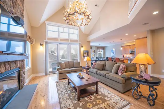Stunning direct Mount Snow views from this spectacular Outlook Townhome just up from the base area at the Mount Snow Ski Resort. This 5 bedroom, 4 bath townhome features rustic natural wood finishes throughout, great natural light, numerous windows, and a rustic charm befitting a luxury ski residence. At the exterior you are greeted by a timber frame style covered porch that wraps around to the rear with exposure to the westerly and southerly views directly over the ski trails, sunsets, and mountains beyond. Inside you'll find a spacious open concept living, dining, and kitchen space, including a vaulted great room with floor to ceiling stone fireplace, granite counters in the custom kitchen with stainless appliances and gas range, wood floors, 2 vaulted suites upstairs including a primary with amazing ski trail views, a main floor suite currently used as an office/den, lower level family room with gas fireplace with stone surround, large bunk room, another legal guest room currently a gym, large mudroom entry with cubbies and coat closet, and an outdoor hot tub to take in the views. The unit also features shuttle service to and from the mountain and painless year round maintenance and landscaping.