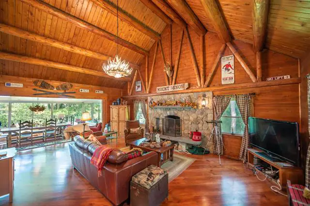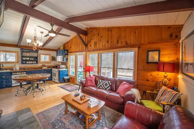Beautiful rustic log sided chalet in Wilmington VT, just a short drive to the village of Wilmington, lakes, and Mount Snow ski resort. This private location is easily accessible off a paved road and is conveniently nearby to the Hogback lookout, Molly Stark state park for great hiking, and Beer Naked Brewery, all with direct snowmobile trail access to all. Inside the home you will find gorgeous upgrades throughout, featuring a large open concept floor plan, beautiful natural light and exposed woodwork, a custom kitchen with soapstone counters and stainless appliances, a large stone hearth with gas fireplace, vaulted upstairs primary suite with jack and jill bath to a guest room, 2 main floor guest rooms near both a half bath and a full bath, all with tiled floors and showers, and a spacious mudroom entry for gear storage in all seasons. There is also a good size deck for entertaining, a detached garage for toys, and ample parking on the level lot. A very nice contender for investment and vacations.