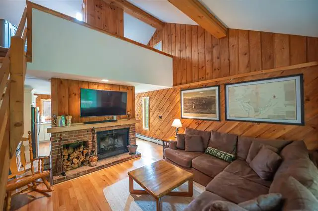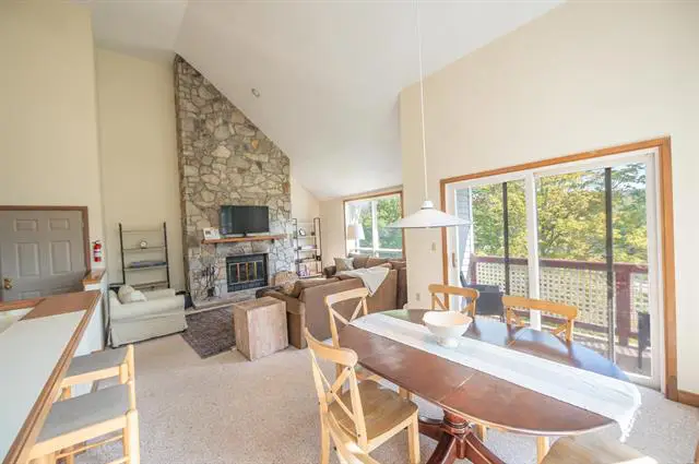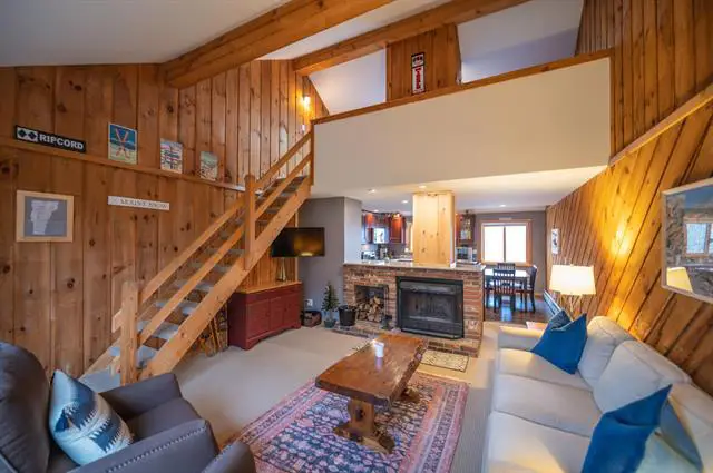 Completely renovated end unit townhome in the Bears Crossing community located on the ski-home trail from Mount Snow with direct shuttle service to and from the mountain. Beautifully updated and turn key condition for immediate enjoyment. This unit sits conveniently across from the amenities building yet with easy access to the shuttle and ski trail. Inside is a woodsy open concept floor plan with vaulted great room, wood burning fireplace and brick hearth, wood floors, rustic exposed paneling, extra windows thanks to the end unit southern facing location, a large eat in kitchen with new cabinets, counters, and appliances, all new windows, a main floor primary suite with upscale tiled bath and window, as well as guest bedroom and second updated bath, a large sleeping loft, mudroom for all your gear, and a rear deck for entertaining or to enjoy the Vermont nature. Bears Crossing amenities include shuttle to and from the base area, an in ground pool for summer fun, large fire fit, tennis courts, club house with exercise equipment, tv, pool table, and ping pong, building maintenance, landscaping, snow removal, trash, recycling, wood, and more.