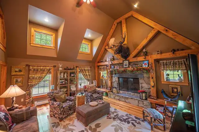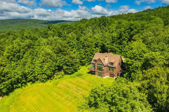 Absolutely stunning log home just north of the main entrance of the Mount Snow ski resort. This pristine property sits nestled on a very private yet easily accessibly 6 acre parcel just north of the mountain, with beautiful direct views of the peak, trails, and sunsets beyond. The property has been beautifully landscaped and has exposed ledge, perennial gardens, a stream, outdoor entertaining space including decks and hot tub, and a direct trail to the vast snowmobile trail system. Inside you are treated to a gorgeous log home style with natural exposed woodwork throughout, a large great room with floor to ceiling stone double sided fireplace, extensive windows for great natural light, a sizeable dining and game area off the custom chefs country kitchen, a beautiful vaulted main floor primary suite with private covered deck, tiled shower, soaking tub, and luxury feel, 2 additional main floor guest rooms with a jack and jill bath, a guest half bath, a large loft open to the main living area, ideal for office or entertainment area, a full finished lower level family room with gas stove, playroom, 2 more guest bedrooms and a full bath, large mudroom entry for gear with cubbies and laundry, and an attached 2 car garage for your vehicles and snowmobiles. Truly the best combination of style, location, proximity, and privacy, that you can likely find anywhere around. Additional acreage available. A must see!