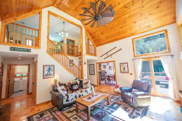When you picture a rustic and woodsy Vermont retreat, but with modern comforts, this is that home. Charming chalet style home located conveniently towards the bottom of Chimney Hill, just a short drive from the village of Wilmington and Mount Snow Ski Resort. This 4 bedroom, 2 bath home has exposed natural woodwork throughout, great open concept living space with a large great room with vaulted ceilings and gas fireplace hardwood floors, beautiful natural light, exposed beams, a newly updated kitchen with granite counters, stone backsplash, and stainless appliances, tremendous entry mudroom for gear with new washer/dryer, a large main floor suite that can also be used for overflow living space, 3 vaulted bedrooms upstairs, 2 updated baths, and less obvious features including a new roof, new skylights, many updated windows, new front door, newly insulated crawlspace with vapor barrier, fresh paint on the exterior, expanded lawn, and resurfaced driveway, The home has plenty of room to stretch, without being too much to maintain, yet is a private location with direct snowmobile trail access. Enjoy a quick drive to skiing, or on off-days take a jaunt to the clubhouse with indoor and outdoor pools, hot tub, gym, game room, theater, basketball court, tennis court, and more. Chimney Hill offers convenient a la carte amenities including trash, plowing, lawn care, and more, to ensure that your time spent in Vermont is for downtime, not upkeep.