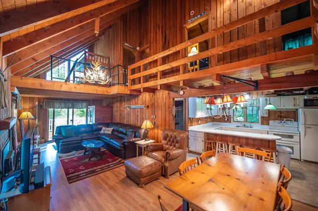 Charming chalet style home located conveniently towards the bottom of Chimney Hill, just a short drive from the village of Wilmington and Mount Snow Ski Resort. This 3 bedroom, 2 bath home has a vaulted great room with exposed natural woodwork throughout, open concept living space with a gas fireplace for efficient heat, beautiful natural light, exposed beams on the vaulted ceiling, a large entertaining deck, mountain views to the east with sunrise exposure and a very private backyard, a kitchen with updated appliances, tremendous entry mudroom for gear, a main floor primary bedroom with bath, second floor bedroom and full bath, and sleeping loft which serves as the 3rd bedroom, and full walkout basement with gas heat that could easily be finished to add an additional 600+ sqft. The home has plenty of room to stretch, without being too much to maintain, yet is a private end of road location with direct snowmobile trail access. Recent updates include a new roof and appliances. Enjoy a quick drive to skiing, or on off-days take a jaunt to the clubhouse with indoor and outdoor pools, hot tub, gym, game room, theater, basketball court, tennis court, and more. Chimney Hill offers convenient a la carte amenities including trash, plowing, lawn care, and more, to ensure that your time spent in Vermont is for downtime, not upkeep. Many windows should be replaced and this is factored into the listing price.