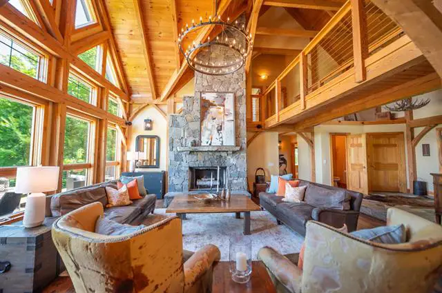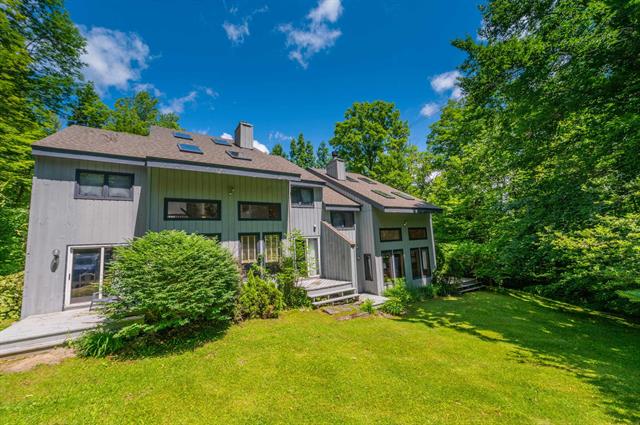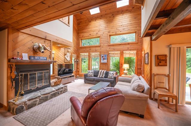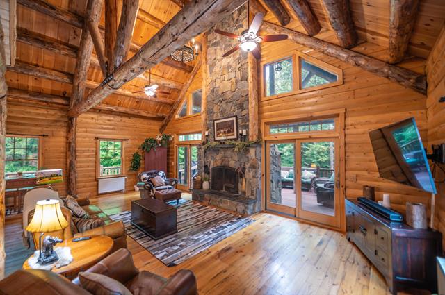 Absolutely stunning log home just north of the main entrance of the Mount Snow ski resort. This pristine property sits nestled on a very private yet easily accessibly 7 acre parcel just north of the mountain, with stunning direct views of the trails, ridgeline, and sunsets beyond. Watch the fireworks and torchlight right from your living room. The property has been beautifully landscaped and has exposed ledge, perennial gardens, a pond, outdoor entertaining space including decks walkways, and direct access to the vast snowmobile trail system. Inside you are treated to a gorgeous log home style with natural exposed woodwork throughout, a large great room with floor to ceiling stone fireplace, extensive windows for great natural light, a sizeable dining area off the custom chefs country kitchen, a beautiful vaulted second floor primary suite with tiled shower and soaking tub, 2 additional main floor guest rooms with a full bath, a large loft open to the main living area, ideal for office or entertainment area, a full finished lower level family room, gym, one more guest bedroom and full bath, additional bonus room, and a 2 car garage for your vehicles and snowmobiles. Truly the best combination of style, location, proximity, and privacy, that you can likely find anywhere around. A must see!