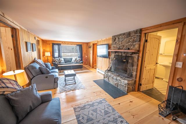 Immaculate trailside 2 bedroom Seasons condo at the Mount Snow ski resort. This is a rare ground floor unit adjacent to the ski trail. Never rented and immaculately maintained and updated. Enjoy an open concept living room with stone floor to ceiling wood burning fireplace, large dining area with walkout access to the yard and trail, perfect for pets or play, entry mudroom area, open kitchen with breakfast bar, updated appliances and counters, ample cabinet space, and pantry, a large guest room and full guest bath, as well as a spacious primary suite with walk in closet, and direct trail access. Each unit has a ski locker to stow your gear, and this unit is on the first floor, meaning easy access after a long day on the slopes. There is also a nice deck for enjoying the Vermont scenery, laundry in the unit, and recently installed hot water heating system. The ski trail is directly adjacent to this building for true ski-in/ski-out access and you also get use of the newly updated amenities building with indoor and outdoor pools, full gym, separate owner and tenant hot tub areas, locker rooms, basketball court, wood and trash, and on site management company allowing for downtime, not upkeep.