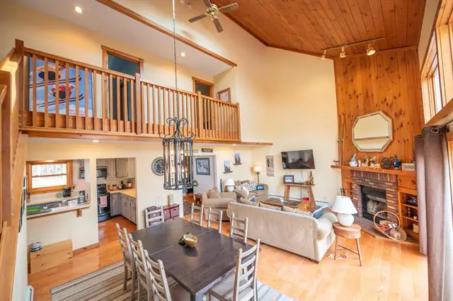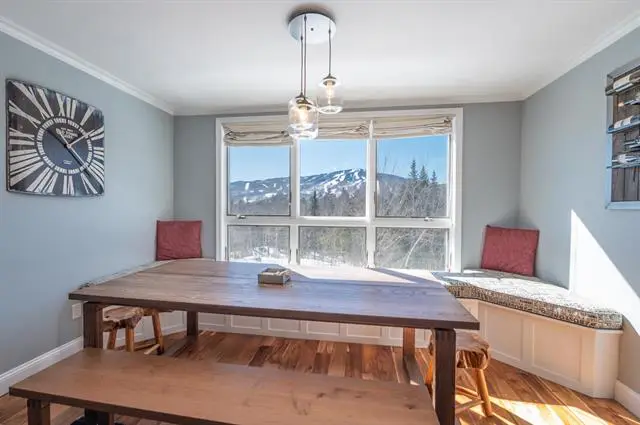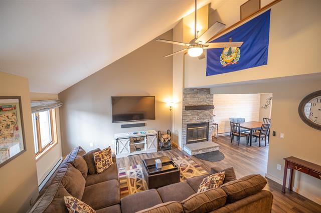 Stunning views and access to Mount Snow! This meticulously maintained Snowtree end unit is located at the base of the Mount Snow ski resort and looks directly out at the slopes of the mountain, so that you can check the conditions from your window in the morning, and watch the fireworks from your living room at night. This open concept unit features tremendous natural light throughout thanks to Southern and Western exposures, a large vaulted living space with wood burning fireplace and brick hearth, kitchen with breakfast bar and wood cabinets, primary suite on the main floor, loft guest suite with great natural light, a dining area, tiled mudroom entry, main floor laundry, great closet spaces throughout, and spacious top floor deck overlooking the view. The unit also offers a ski locker in the building, club house with outdoor pool and indoor hot tub, building maintenance, snow removal, shuttle to and from the base area, and more. The gorgeous views can be enjoyed year round and the condo convenience affords plenty of downtime, not upkeep.