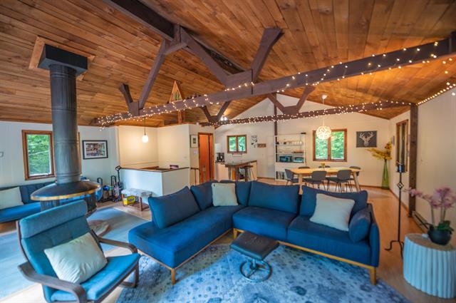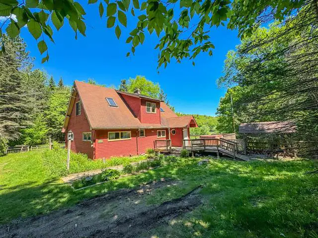 Absolutely idyllic swiss chalet in the Spruce Lake Estates community of Wilmington, with shared lake access, a beach area, tennis court, and more. This lovely home sits just outside the village of Wilmington for shopping and dining, as well as near to the Mount Snow ski resort, and the nearby larger lakes. The owners have updated and maintained the home since the 80s and are moving on to the next chapter, allowing a new owner to make just as many great memories. Inside the home you will find true post and beam construction with beautiful open spaces. There is a vaulted living room with scandanavian fireplace that throws great heat, tremendous natural light thanks to many windows, a large open kitchen and dining area also vaulted, a main floor primary bedroom with walk-in closet and full bath, a good sized guest bedroom and bath upstairs, as well as large loft for overflow sleeping or entertainment space, two lower level guest bedrooms, a third full bath, large entry mudroom area with coat closets and laundry room with second fridge and extra owner storage, outdoor brick entry, firewood shed, garden shed, wraparound deck for outdoor enjoyment, and a lovely private lot with stream adjacent to the home. This home is lovely and turn key, but could also be updated for tremendous rentability and equity growth. Being offered furnished less decor and personal items. Seller is moving abroad so would like to close late fall. One lower bedroom does not have legal egress.