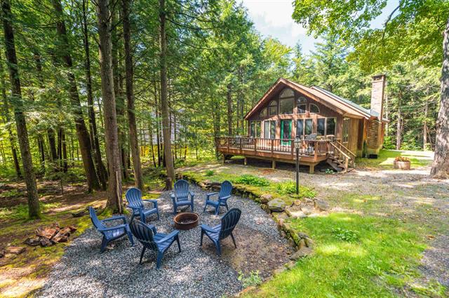 Charming woodsy chalet located just off the back side of the Haystack Golf Course with direct snowmobile trail access, nearby village and lake access, and just a short drive to the Mount Snow ski resort. Located on a quiet cul de sac with convenient public water and sewer, this home sits on a private double lot with amazing privacy, and ample parking, a shed for toys, fire pit, and nice natural light through the trees. Inside is a vaulted great room with natural wood paneling throughout, for a great Vermont look. There is a large living space with pellet burning stove, open concept vaulted kitchen with island, and updated stainless appliances, spacious dining area and secondary living space looking out through the expansive windows, main floor primary suite with updated bath, 2 guest rooms and a full updated guest bath, new vinyl plank flooring through, large mudroom entry and laundry area, and a large sleeping/play loft space ideal for overflow sleeping or second sitting area. There is a full height unfinished basement that could easily double the square footage of the home, with full size windows and a walkout door, Buderus high efficiency heating system, and tremendous potential. There is also a large deck for entertaining, and convenient trash disposal area for the community. New shingle roof on half in 2023 and amazing metal roof on the other half. A great amount of space and ease of use for downtime, not upkeep.