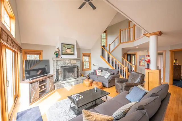 Stunning ski trail views of both Mount Snow and Haystack, from this 5000+ sqft home nestled in the Dover Hills. Experience the best of both worlds with nearby access to the ski resort, yet also tremendous views and privacy at this end of road location. The meticulously maintained property sits above the road with a paved drive, pond, gazebo, and perennial gardens with garden shed. Inside you are treated to stunning recently renovated spaces for true turn key enjoyment. The open concept floor plan features a large vaulted great room with views of the ridgeline and sunsets beyond from nearly every window, a gas fireplace in the living area and wood floors, a gorgeous chefs kitchen with breakfast bar, granite counters, stainless appliances, and wood burning fireplace in the breakfast nook, guest half bath off the kitchen, a primary main floor suite with tiled bath, a hot tub bonus room overlooking the views with gas fireplace, two upstairs guest bedrooms with a jack and jill bath, a large separate family room with gas fireplace with stone surround, pool table, and vaulted natural wood ceilings, a lower level second family room with wine cellar, bunk room and full bath, and tremendous mudroom entry space off the two car garage. There is also a great rear dining deck, a front deck for taking in the views, and ample parking. A must see!