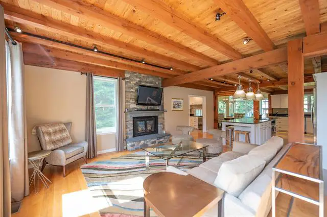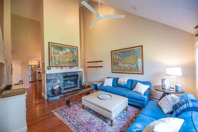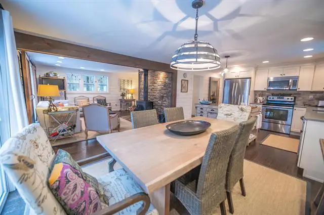 A rare opportunity for a Spruce Haven townhome accessible to the Dover village, Valley Trail, Mount Snow Ski Resort and Golf Course, the Hermitage private ski club, and MOOver shuttle service just down the street. This spacious and fully renovated end unit townhome has 3 bedrooms with en suite baths, a main floor guest half bath, a large open concept living space with hearth and efficient gas fireplace, exposed wood beams, custom built in storage and bench, an updated kitchen with island, breakfast bar, Viking appliances, granite counters, and dining area. There is extensive custom lighting throughout, fully updated bathrooms, and a full size washer-dryer. Two of the suites are on the second floor, including a primary with steam shower, and then the large vaulted bunk room with bath is on the third floor. There are ample closets, additional large eave storage, and rear wood storage. Newer Anderson windows and sliders throughout. This unit has a sunny back patio for year round enjoyment and easy access to dining and shopping. Trash service, building maintenance, snow removal, and landscaping are included in the low HOA fees.
