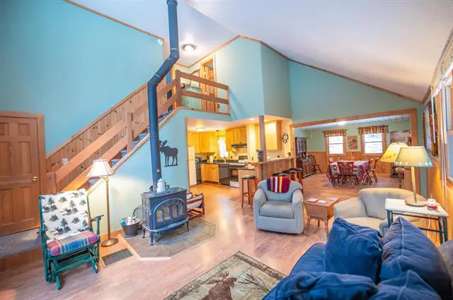 Beautiful updated contemporary chalet located in the Chimney Hill Community just outside the village of Wilmington. This fully renovated and upgraded home has nearby access to Lake Whitingham, is a short drive to the Mt Snow ski resort, and access to one of the best hiking areas in Southern Vermont up Haystack Mountain, thanks to the community adjacent Green Mountain National Forest. It sits nestled on a private double lot on a quiet side road. Inside you will find a lovely open concept living space with natural light, wooden beams, an open living room with wood burning stove, and stone hearth, new kitchen with custom cabinets, stainless appliances, and antique island, updated rustic flooring, a main floor bedroom with shiplap walls and bright feel, main floor bath with antique vanity and tiled shower, a full finished walkout lower level family room, two guest bedrooms, second full tiled bath, lower level rear access to the covered porch ideal for hot tub, main level mudroom with cubbies for gear and laundry, timberframe style covered front porch, spacious rear deck for entertaining, and patio with fire pit. This home has been extensively renovated and refurnished for truly turn key enjoyment. This includes the amazing Chimney Hill amenities of indoor and outdoor pools, clubhouse, theater, gym, hot tub, basketball court, tennis courts, winter ice skating, and a la carte services like plowing and trash, to afford yourself plenty of downtime, not upkeep.
