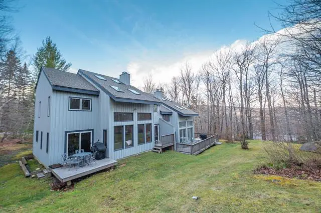 Beautiful updated contemporary chalet located just down from the Chimney Hill Clubhouse in Wilmington. This charming home has nearby access to the country village of Wilmington, Lake Whitingham, is a short drive to the Mt Snow ski resort, and has nearby to one of the best hiking areas in Southern Vermont, thanks to the community adjacent Green Mountain National Forest. It sits nestled on a private lot in the Chimney Hill community on a quiet side road. Inside you will find a lovely open concept living space with vaulted ceilings and exposed woodwork, great natural light thanks to large windows, a spacious great room with wood burning fireplace, brick hearth, and exposed beams, updated kitchen with stainless appliances and quartz counters, updated wood flooring, a main floor primary suite, 2 upstairs bedrooms, as well as a full bath and loft for play or overflow sleeping, a full finished walkout lower level family room, fourth bedroom and en suite bath, lower level foyer, and main level mudroom, garage, ample storage, laundry, and more. This home has been extensively renovated for truly turn key enjoyment. This includes the amazing Chimney Hill amenities of indoor and outdoor pools, clubhouse, theater, gym, hot tub, basketball court, tennis courts, winter ice skating, and a la carte services like plowing and trash, to afford yourself plenty of downtime, not upkeep. Septic sized for 3 bedrooms full time use.